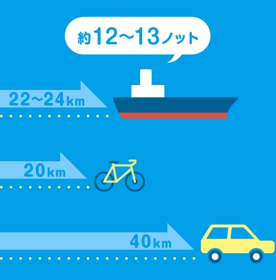 船の速度は「ノット」という単位であらわされるのを知っているかな。1ノットは、1時間に1,852メートル進む速度。貨物船の速度はだいたい12〜13ノットだから、時速になおすと22〜24キロメートルになる。自転車の平均速度は時速約20キロメートルと言われているから、自転車よりも少し速くて、街中を走る自動車よりもおそい速さで海の上を移動しているんだ。ちなみに世界最高峰のヨットレースであるアメリカズカップに出場するヨットは時速90キロメートル以上も出すぞ。すごい速さだね。